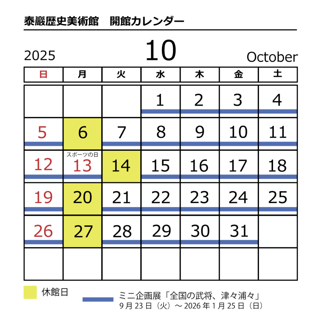 10月の休館日は、6日(月)、14日(火)、16日(火)、20日(月)、27日(月)です。