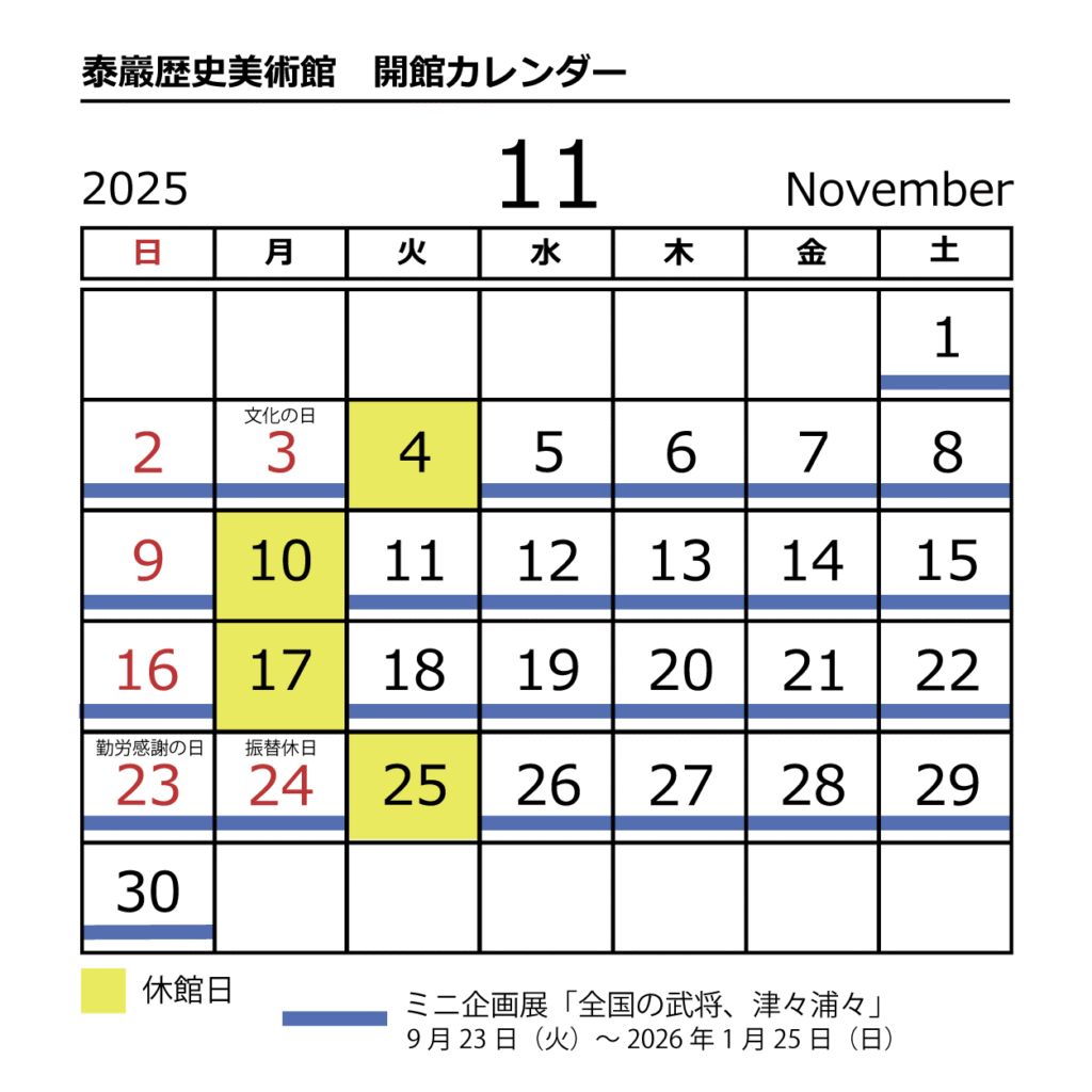 11月の休館日は、4日(火)、10日(月)、17日(月)、25日(火)です。