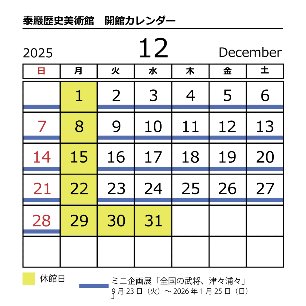 12月の休館日は、1日(月)、8日(月)、15日(月)、22日(月)、29日(月)~31(水)です。